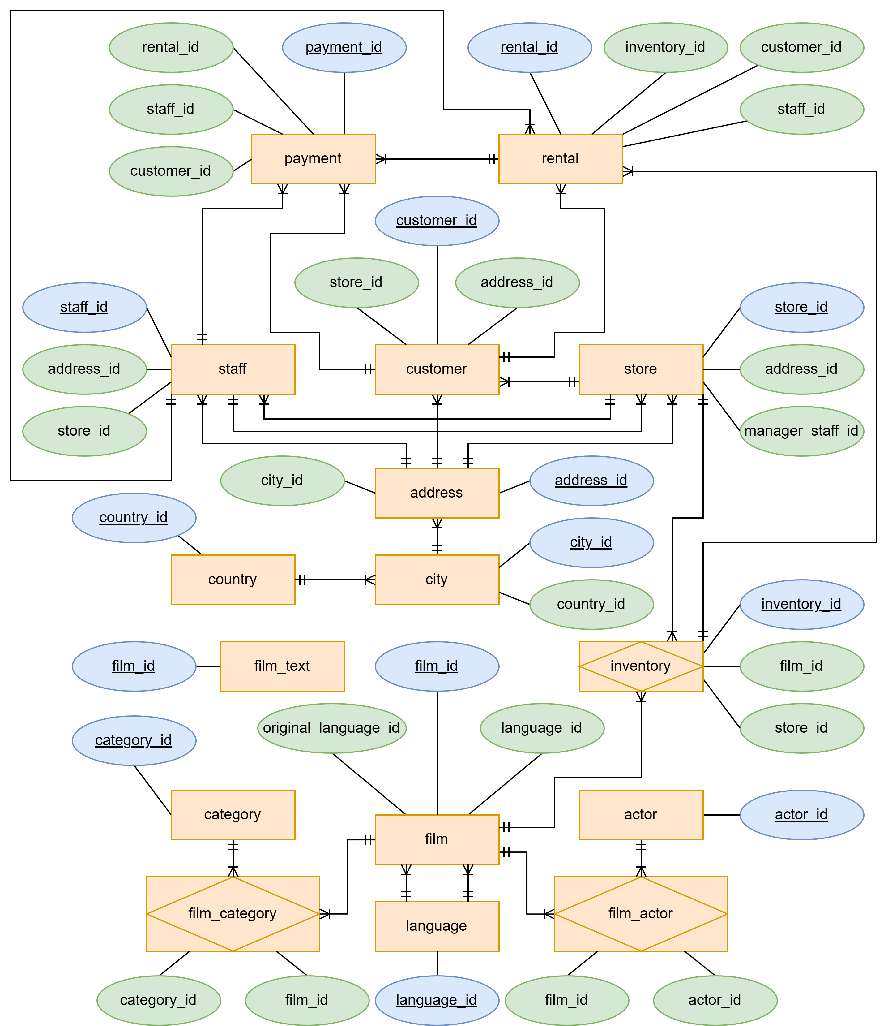 The diagram provided is the database design of a film rental chain store for handling inventory, films, customers, staff and payments.